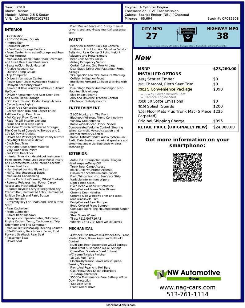 NW Automotive Group takes pride in offering high-quality, pre-owned vehicles. We are conveniently located in the heart of Cincinnati, just minutes of I-75. Our transparent pricing policy ensures that you receive the best possible deal, with significant discounts already applied. Purchasing from us is straightforward: you can pay in cash or allow our skilled business managers to secure the optimal financing rate through our network of lending partners. We have established partnerships with leading institutions such as Capital One, Santander, Exeter, Kemba CU, Sharefax CU and more. Contact us to verify if we collaborate with your preferred lender. Easily apply through our website for a swift approval process. Thank you for considering NW Automotive Group for your next vehicle acquisition. We offer competitive prices for your current vehicle, bring it in today for a complimentary appraisal. ***Internet special. Advertised price includes a $500 incentive/discount for financing with one of our preferred lenders. Traditional and special financing is available for qualified buyers (subject to approved credit). Please contact us first for availability, as our vehicles sell quickly. Prices are subject to change. Sales Tax, Title, License Fee, Registration Fee, Dealer Documentary Fee, Finance Charges, Emission Testing Fees and Compliance Fees are additional to the advertised price. All options and conditions of the vehicles must be verified with the dealer, any descriptions or options that are listed maybe incorrect due to automatic data transfer. Please contact a dealer for more details.